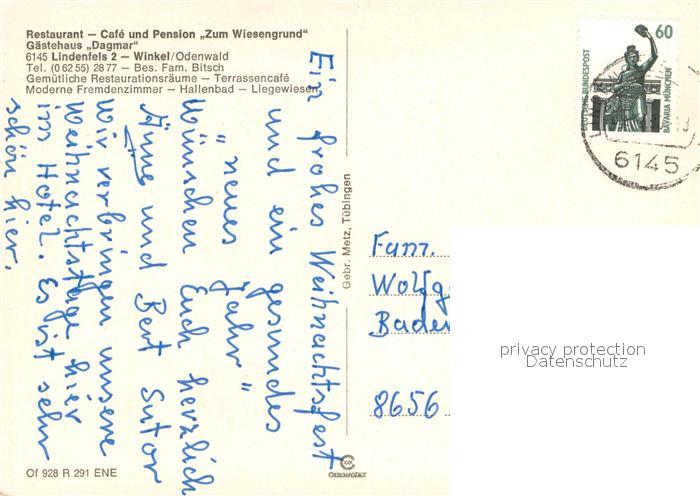 73649210 alte Postkarte Winkel Lindenfels Restaurant Cafe Pension Zum Wiesengrund postalisch gelaufen Erhaltung siehe scans [FriedD77] KatCode: 11110006431015