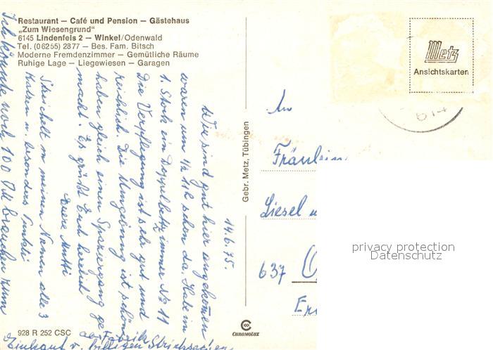 73091479 alte Postkarte Winkel Lindenfels Restaurant Zum Wiesengrund postalisch gelaufen Erhaltung siehe scans [NatalD47] KatCode: 11110006431015