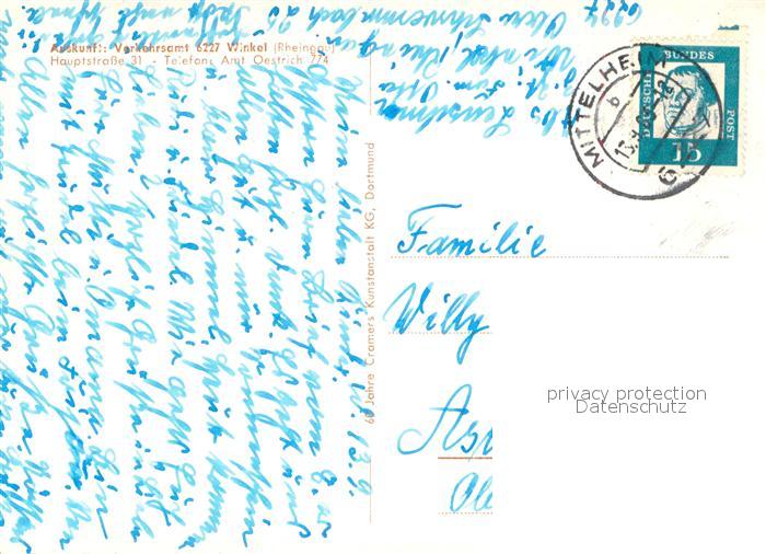 73673424 alte Postkarte Winkel Oestrich-Winkel Schiffsanlegestelle Panorama Rhein Weinlese Paul Hoeltge Park postalisch gelaufen Erhaltung siehe scans [FriedD77] KatCode: 11110006439012