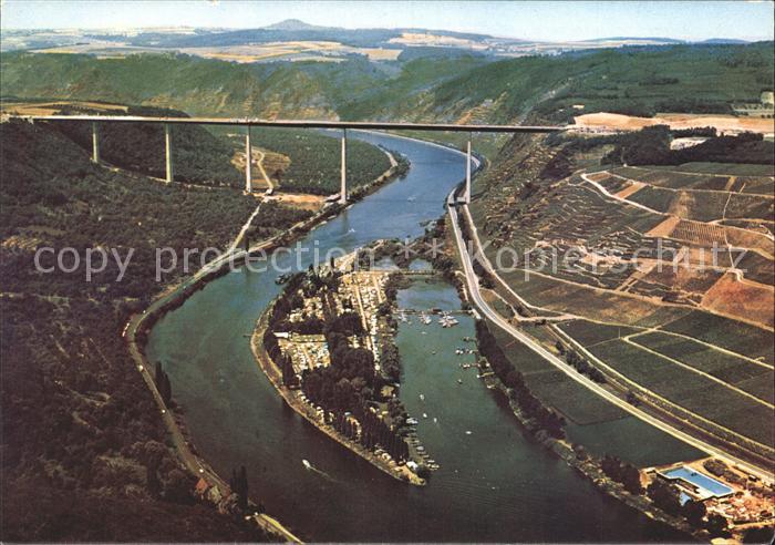 Winningen Mosel Campinginsel mit Blick auf Moselbruecke Fliegeraufnahme