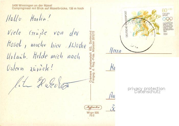 73020576 alte Postkarte Winningen Mosel Campinginsel mit Moselbruecke Fliegeraufnahme postalisch gelaufen Erhaltung siehe scans [WerneD78] KatCode: 11110007137230