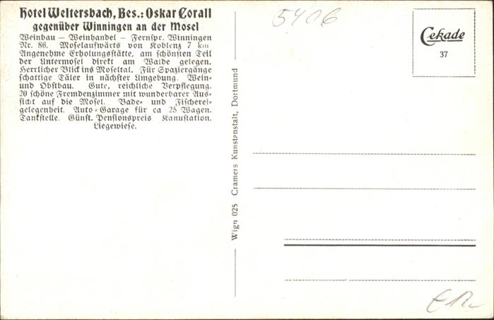 40931231 Winningen Mosel Hotel Weltersbach postalisch nicht gelaufen Alte Ansichtskarte Postkarte Katcode 11110007137230