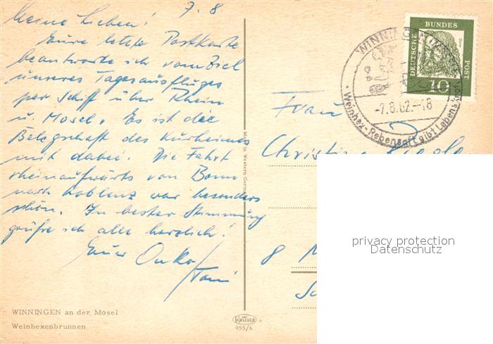 73173296 alte Postkarte Winningen Mosel Weinhexenbrunnen Altstadt Fachwerkhaeuser postalisch gelaufen Erhaltung siehe scans [FriedD77] KatCode: 11110007137230