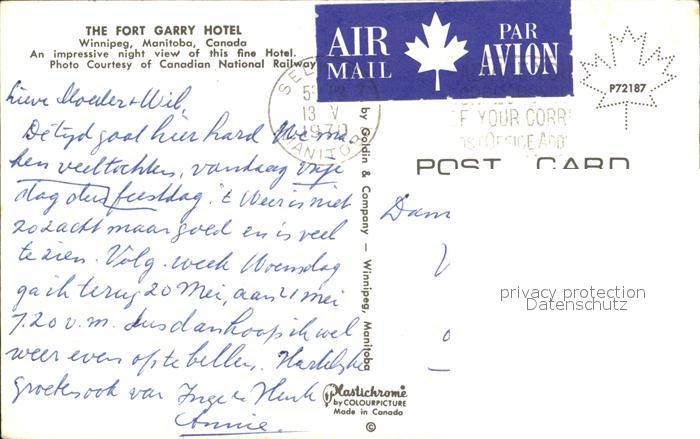 old postcard Winnipeg Fort Garry Hotel at night postalisch gelaufen Erhaltung siehe scans