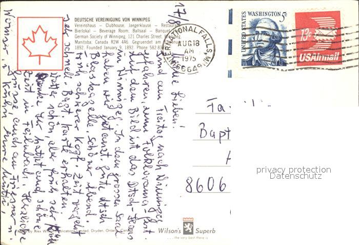 old postcard Winnipeg Vereinshaus Deutsche Vereinigung von Winnipeg Restaurant Saal postalisch gelaufen Erhaltung siehe scans