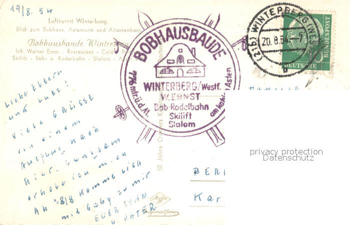 73617604 alte Postkarte Winterberg Hochsauerland Blick zum Bobhaus Astenturm Altastenberg Fliegeraufnahme postalisch gelaufen Erhaltung siehe scans [FriedD77] KatCode: 11110005958048