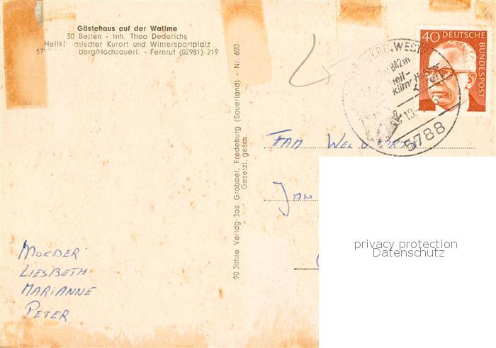 73787422 alte Postkarte Winterberg Hochsauerland Gaestehaus auf der Wallme Gastraeume postalisch gelaufen Erhaltung siehe scans [FriedD77] KatCode: 11110005958048