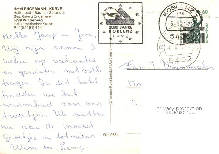 72926979 alte Postkarte Winterberg Hochsauerland Hotel Engemann-Kurve postalisch gelaufen Erhaltung siehe scans [NatalD47] KatCode: 11110005958048