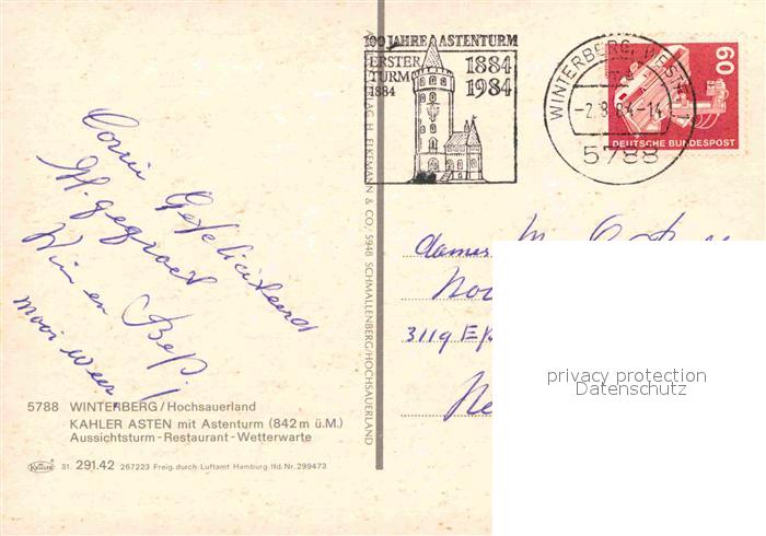 72823310 alte Postkarte Winterberg Hochsauerland Kahler Asten mit Astenturm Aussichtsturm Restaurant Wetterwarte Fliegeraufnahme postalisch gelaufen Erhaltung siehe scans [FriedD77] KatCode: 11110005958048