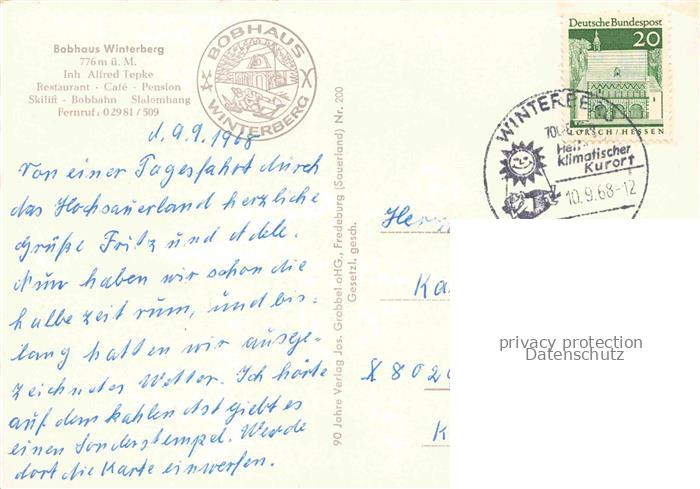 74037764 alte Postkarte Winterberg Hochsauerland NRW Bobhaus Winterberg Restaurant Café Pension Minigolf Wassertreten postalisch gelaufen Erhaltung siehe scans [FriedD77] KatCode: 11110005958048