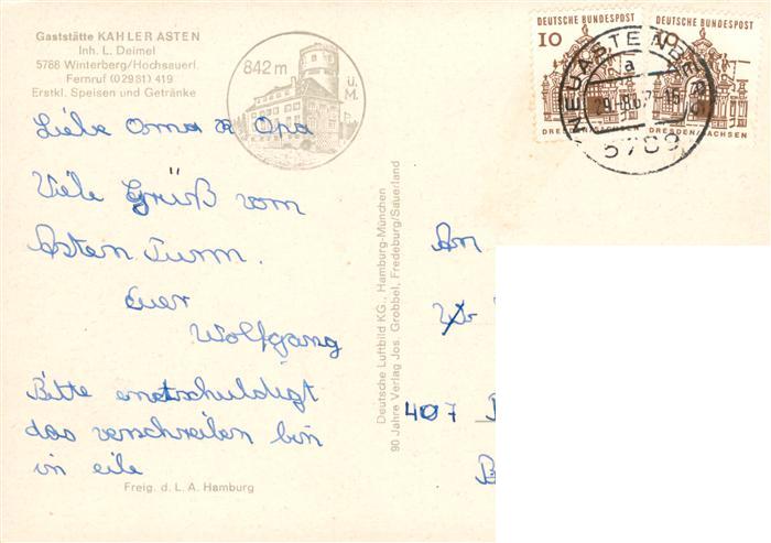73942890 Winterberg Hochsauerland NRW Fliegeraufnahme mit Gaststaette Kahler Asten postalisch gelaufen Erhaltung siehe scans [WerneD78] alte Postkarte Wern Katcode 11110005958048