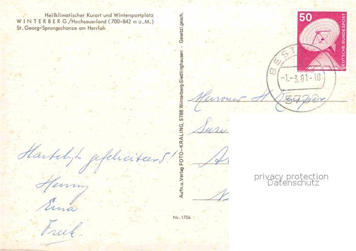 72727815 alte Postkarte Winterberg Hochsauerland Skigebiet mit St. Georg-Sprungschanze am Herrloh postalisch gelaufen Erhaltung siehe scans [LiesaD40] KatCode: 11110005958048
