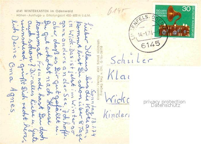 72733192 alte Postkarte Winterkasten Lindenfels Erholungsort im Odenwald Fliegeraufnahme postalisch gelaufen Erhaltung siehe scans [FriedD77] KatCode: 11110006431015
