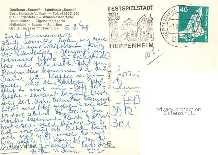 73204368 alte Postkarte Winterkasten Lindenfels Gasthaus Sonne Landhaus postalisch gelaufen Erhaltung siehe scans [FriedD77] KatCode: 11110006431015