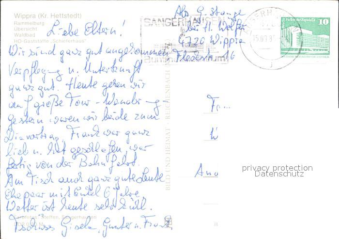 72337059 alte Postkarte Wippra Rammelburg uebersicht Waldbad HO Gaststaette Schieferhaus Fachwerk postalisch gelaufen Erhaltung siehe scans KatCode: 11110015087480