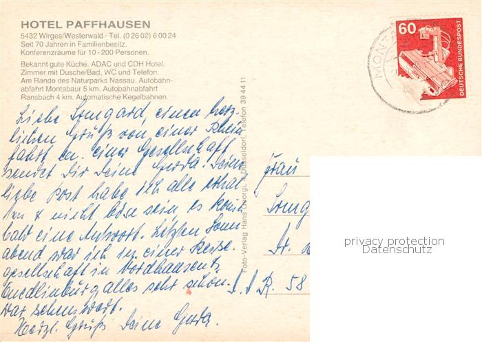 73844009 alte Postkarte Wirges Hotel Paffhausen Gastraeume postalisch gelaufen Erhaltung siehe scans [WerneD78] KatCode: 11110007143081