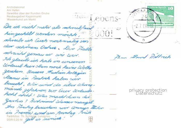 72651948 alte Postkarte Wismar Mecklenburg Archidiakonat Am Hafen Gewoelbe ueber der Runden Grube Kagenmarkt Wasserkunst Markt postalisch gelaufen Erhaltung siehe scans [WerneD78] KatCode: 11110013006000