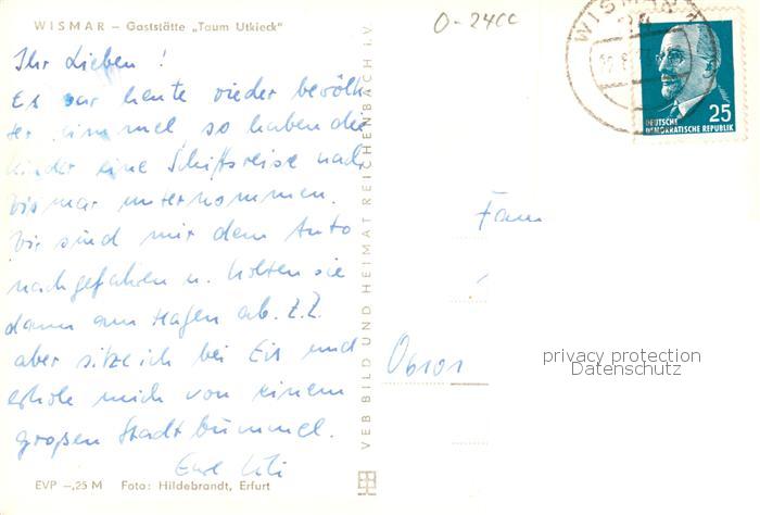 73854413 alte Postkarte Wismar Mecklenburg Gaststaette Taum Utkieck Gartenterrasse postalisch gelaufen Erhaltung siehe scans [FriedD77] KatCode: 11110013006000