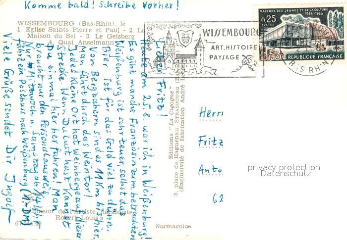 13160856 carte postale Wissembourg Eglise Saints Pierre et Paul Le Maison du Sel Le Geisberg Quai Anselmann postalisch gelaufen Erhaltung siehe scans [WerneD78] KatCode: 11170067767544