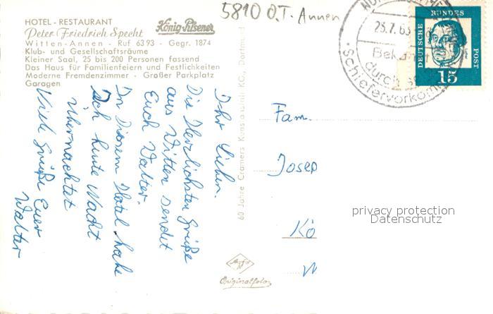73708799 alte Postkarte Witten-Annen Hotel-Restaurant Peter Friedrich Specht Innen- und Aussenansichten postalisch gelaufen Erhaltung siehe scans [LiesaD40] KatCode: 11110005954036