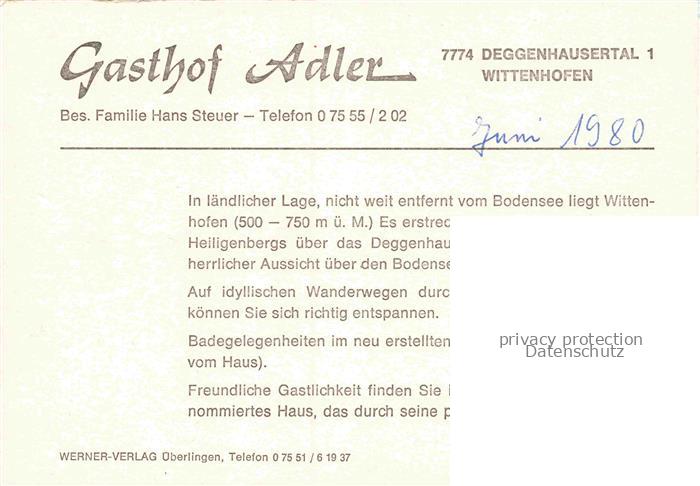 74104113 Wittenhofen Deggenhausertal Bodenseekreis BW Gasthof Adler postalisch nicht gelaufen Werbekarte (keine Postkarte) Erhaltung siehe scans [FriedD77] KatCode: 11110008435067
