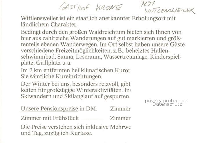 73658672 Wittlensweiler Gasthof Krone Gastraum Landschaftspanorama Teich Schwarzwald postalisch nicht gelaufen Werbekarte (keine Postkarte) Erhaltung siehe scans [FriedD77] KatCode: 11110008237028