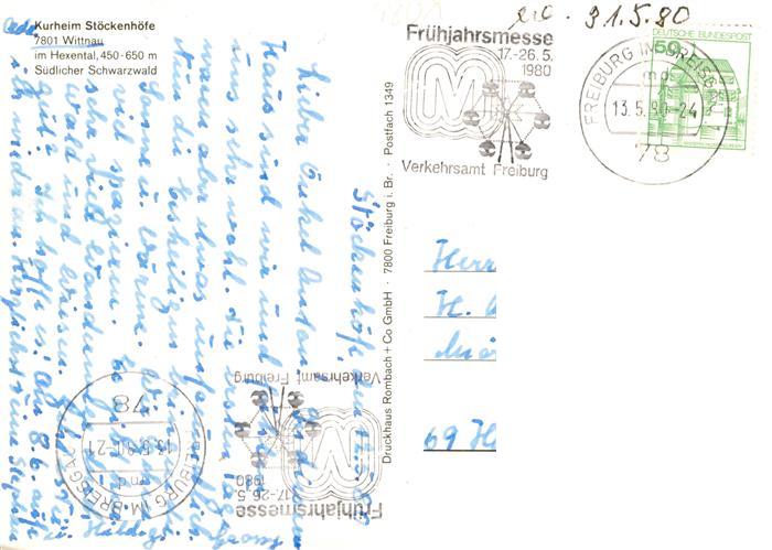 73932796 alte Postkarte Wittnau Breisgau Schwarzwald Kurheim Stoeckenhoefe im Hexental postalisch gelaufen Erhaltung siehe scans [WerneD78] KatCode: 11110008315125