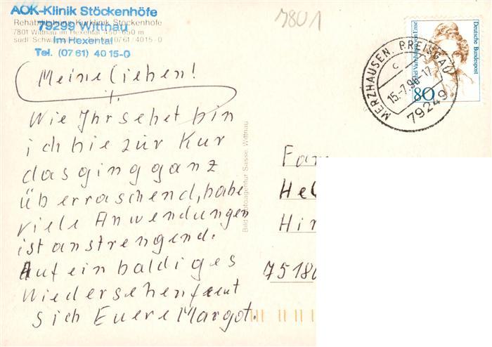 73932086 alte Postkarte Wittnau Breisgau Schwarzwald Rehabilitations-Kurklinik Stoeckenhoefe der LVA Baden postalisch gelaufen Erhaltung siehe scans [FriedD77] KatCode: 11110008315125