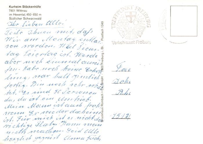 73932069 alte Postkarte Wittnau Breisgau Schwarzwald Rehabilitations-Kurklinik Stoeckenhoefe der LVA Baden postalisch gelaufen Erhaltung siehe scans [FriedD77] KatCode: 11110008315125