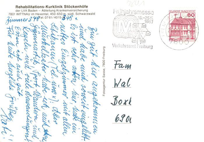 73932059 alte Postkarte Wittnau Breisgau Schwarzwald Rehabilitations-Kurklinik Stoeckenhoefe der LVA Baden postalisch gelaufen Erhaltung siehe scans [FriedD77] KatCode: 11110008315125