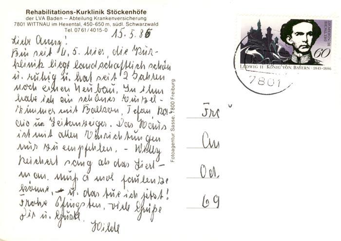 73932046 alte Postkarte Wittnau Breisgau Schwarzwald Rehabilitations-Kurklinik Stoeckenhoefe der LVA Baden postalisch gelaufen Erhaltung siehe scans [FriedD77] KatCode: 11110008315125