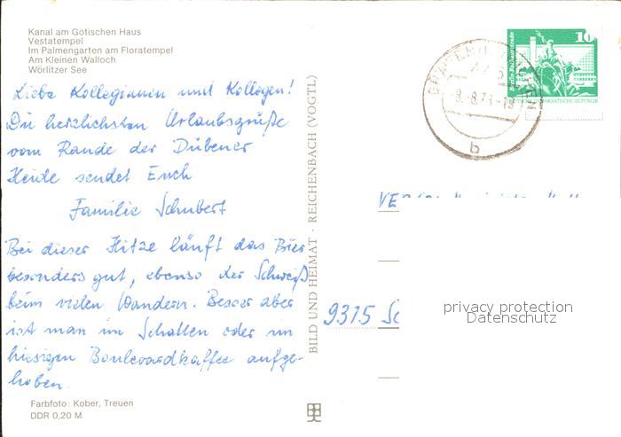 72382671 alte Postkarte Woerlitz Kanal Gotischen-Haus Vestatempel Palmengarten Floratempel postalisch gelaufen Erhaltung siehe scans KatCode: 11110015091380