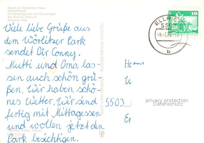 73127659 alte Postkarte Woerlitz Landschaftspark Kanal Gotisches Haus Vestatempel Palmengarten postalisch gelaufen Erhaltung siehe scans [KathaD81] KatCode: 11110015091380