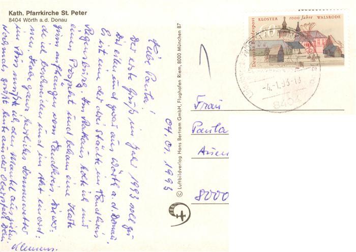 73879278 alte Postkarte Woerth Donau Kath Pfarrkirche St Peter Fliegeraufnahme postalisch gelaufen Erhaltung siehe scans [WerneD78] KatCode: 11110009375210