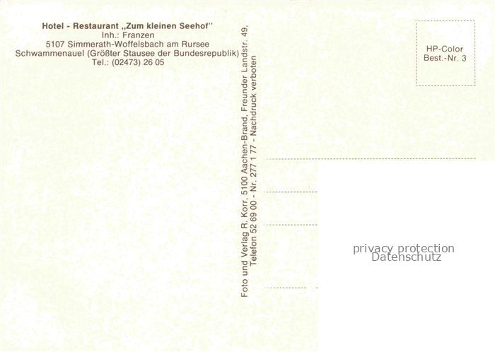 74036173 Woffelsbach Simmerath Hotel Restaurant Zum kleinen Seehof am Rursee Schwammenauel postalisch nicht gelaufen Erhaltung siehe scans [FriedD77] KatCode: 11110005354028