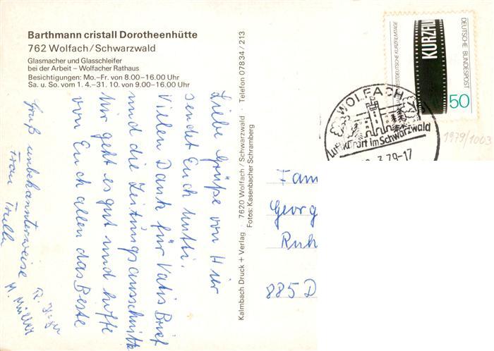 73879464 alte Postkarte Wolfach Barthmann cristall Dorotheenhuette Glasmacher Glasschleifer bei der Arbeit Rathaus postalisch gelaufen Erhaltung siehe scans [FriedD77] KatCode: 11110008317145