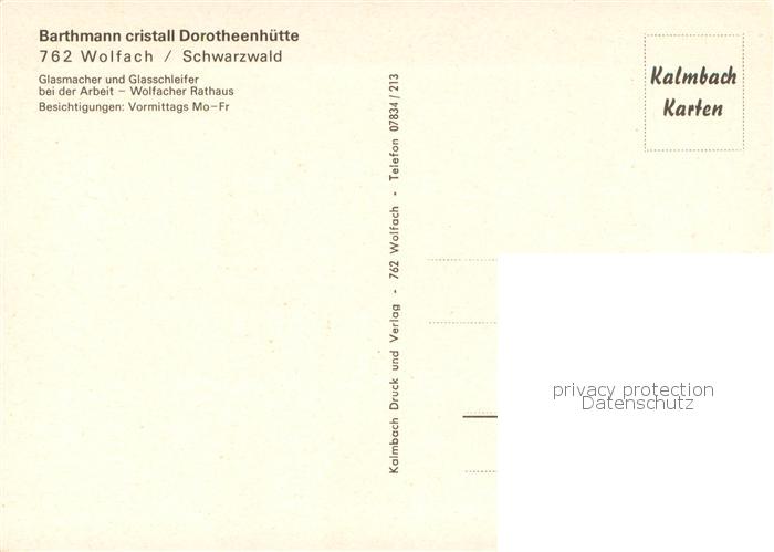 73776765 Wolfach Barthmann Cristall Dorotheenhuette Glasmacher und Glasschleifer bei der Arbeit Wolfacher Rathaus postalisch nicht gelaufen Erhaltung siehe scans [WerneD78] KatCode: 11110008317145