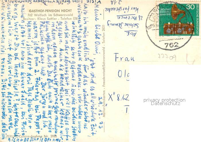 73730702 alte Postkarte Wolfach Gasthof Pension Hecht Gastraum Fachwerkhaeuser Altstadt postalisch gelaufen Erhaltung siehe scans [FriedD77] KatCode: 11110008317145