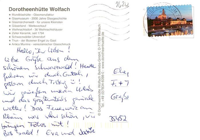 73931282 alte Postkarte Wolfach Schwarzwald Dorotheenhuette Wolfach Mundblashuette Glasmuseum Glaeserland Weihnachtsdorf Zeller Keramik Schwarzwaelder Uhrendorf Thun der Bozener Engel zu Gast Antica Murrina postalisch gelaufen Erhaltung siehe scans [FriedD77] KatCode: 11110008317145