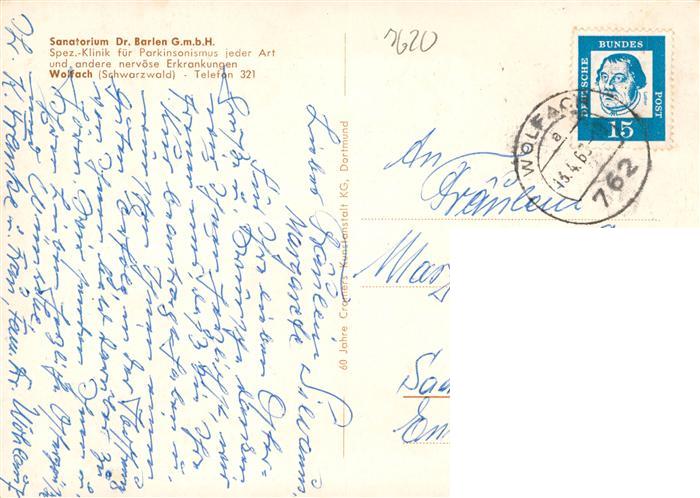 73931087 alte Postkarte Wolfach Schwarzwald Turm Kinzigpartie Ortspartien Sanatorium Dr Barlen Schwimmbad postalisch gelaufen Erhaltung siehe scans [FriedD77] KatCode: 11110008317145