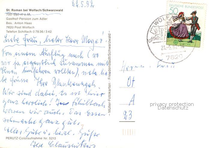 72959906 alte Postkarte Wolfach St Roman Gasthof Pension zum Adler Gastraum postalisch gelaufen Erhaltung siehe scans [WerneD78] KatCode: 11110008317145