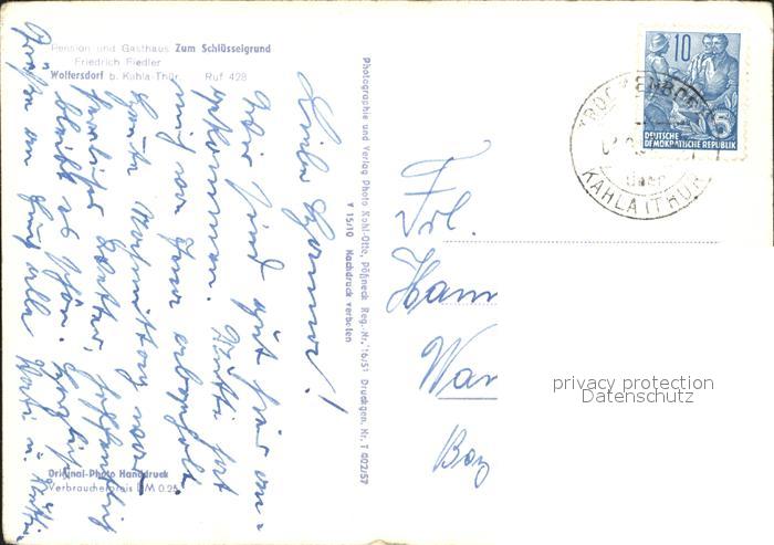 72314984 alte Postkarte Wolfersdorf Thueringen Pension Gasthaus Zum Schluesselgrund See postalisch gelaufen Erhaltung siehe scans KatCode: 11110016074102