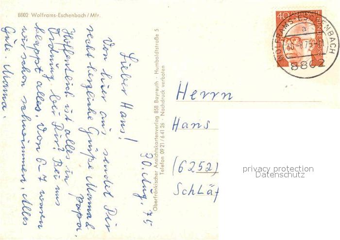 72851928 alte Postkarte Wolframs-Eschenbach Teilansichten Kirche Brunnen Denkmal Turm Stadt des Minnesaengers postalisch gelaufen Erhaltung siehe scans [FriedD77] KatCode: 11110009571229