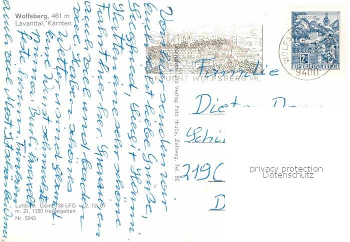 72814003 alte Postkarte Wolfsberg Kaernten Fliegeraufnahme Lavanttal postalisch gelaufen Erhaltung siehe scans [LiesaD40] KatCode: 11390213020923