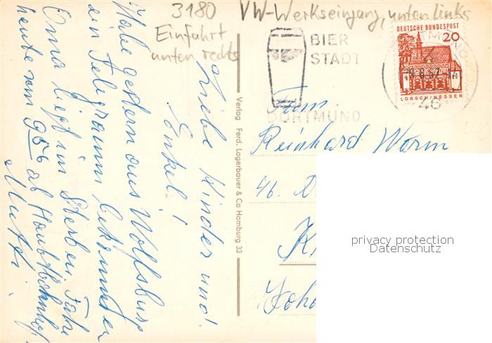 73864985 alte Postkarte Wolfsburg Volkswagen Werk Eingang Einfahrt Fahrgastschiff postalisch gelaufen Erhaltung siehe scans [WerneD78] KatCode: 11110003103000