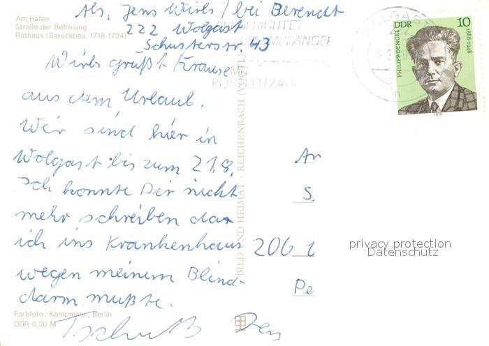 72950750 alte Postkarte Wolgast Mecklenburg-Vorpommern Am Hafen Strasse der Befreiung Rathaus postalisch gelaufen Erhaltung siehe scans [WerneD78] KatCode: 11110013059101
