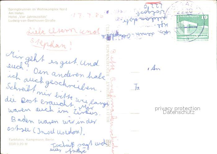 72138716 alte Postkarte Wolgast Mecklenburg-Vorpommern Springbrunnen Am Hafen Hotel Vier Jahreszeiten Ludwig van Beethoven Str postalisch gelaufen KatCode: 11110013059101