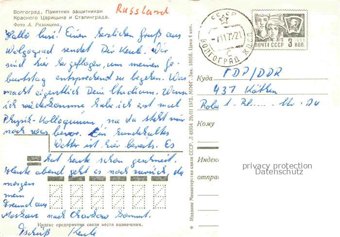 74042083 old postcard Wolgograd Volgograd RU Denkmal fuer Beschuetzer Zarizena Stalingrada postalisch gelaufen Erhaltung siehe scans [IrynaD87] KatCode: 11440