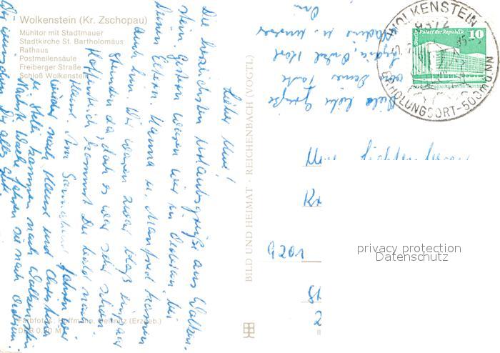 73013678 alte Postkarte Wolkenstein Erzgebirge Muehltor mit Stadtmauer Stadtkirche St Bartholomaeus Rathaus Postmeilensaeule Freiberger Strasse Schloss Wolkenstein postalisch gelaufen Erhaltung siehe scans [WerneD78] KatCode: 11110014181390