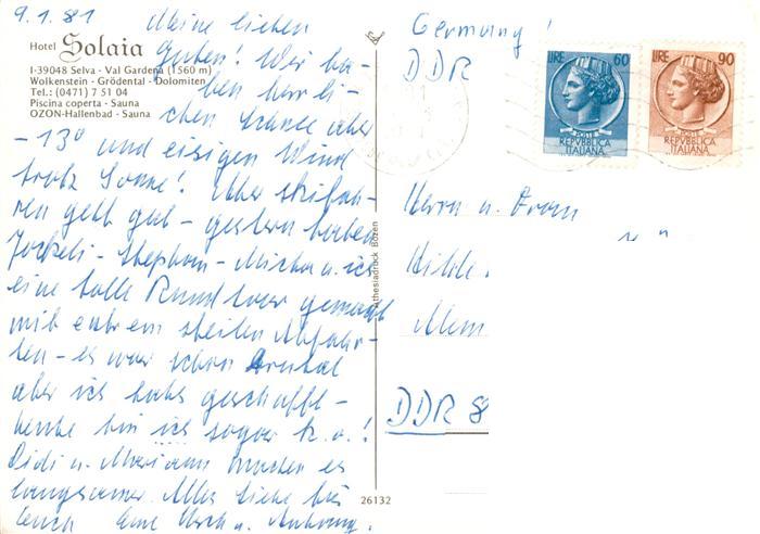 73907109 old postcard Wolkenstein Groeden Hotel Solaia postalisch gelaufen Erhaltung siehe scans [FriedD77] KatCode: 11240